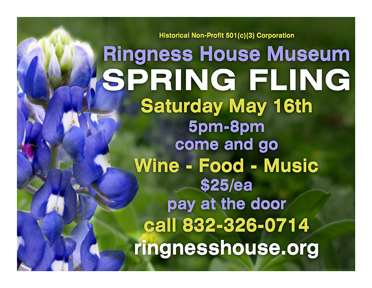 The Ringness House Museum will host the 2026 Spring Fling on Saturday, May 16, 2026 from 5pm to 8pm. Wine and Food will be served and music will be played. Cost is $25 per person, and you pay at the door. If you have any questions, call 832-326-0714. Visit our website http://ringnesshouse.org for directions, thanks!